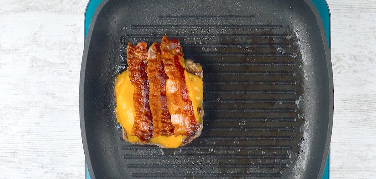 5. Würze das Hackfleisch mit Salz sowie Pfeffer und forme daraus einen Patty. Dieser sollte so groß sein, dass er in das größte Rechteck des Burger-Buns passt. Brate den Patty dann von beiden Seiten an. Belege ihn, kurz bevor er fertig ist, mit zwei Scheiben Cheddar. Brate zeitgleich den Bacon mit an und lege diesen auf den geschmolzenen Käse.
