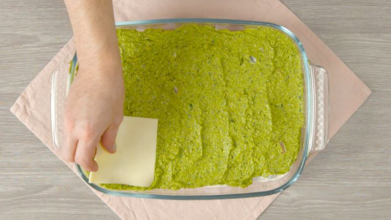 7. Stelle nun das Pesto her, indem du die Zutaten in einen Multizerkleinerer gibst oder mit einem Stabmixer zerkleinerst. Bestreiche die Päckchen mit etwas Butter und gib auf jedes noch einen Esslöffel Pesto, das du danach gleichmäßig verstreichst. Lege abschließend auf jedes Päckchen noch eine Scheibe Käse.