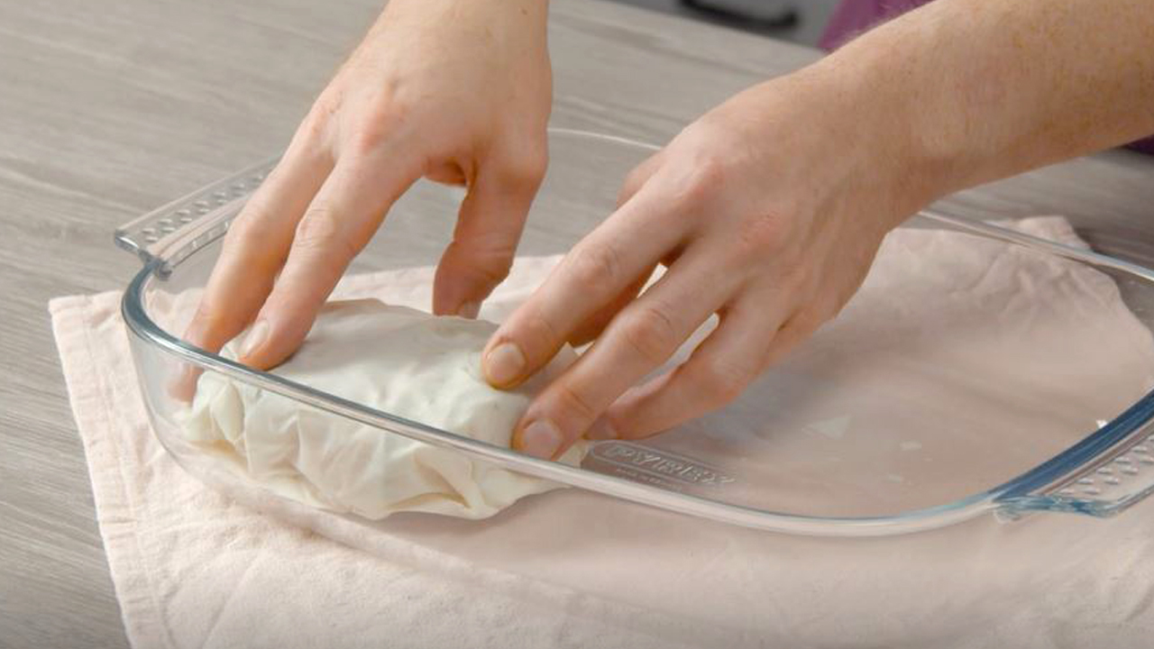 2. Lege zunächst 3 Filoteigblätter übereinander und platziere sie mittig auf der kleinen Form.