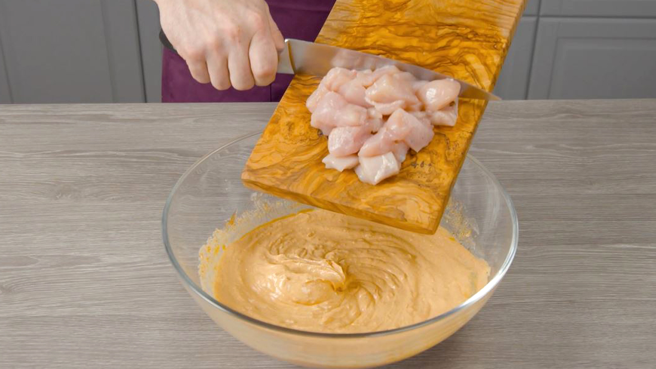 1. Beginne mit der Zubereitung des Kebab-Hähnchens, indem du alle Zutaten gut miteinander vermischst. Schneide die Hähnchenbrüste dann in kleine Würfel, vermenge sie mit der Marinade und stelle alles zusammen für mindestens 4 Stunden in den Kühlschrank, besser noch über Nacht.