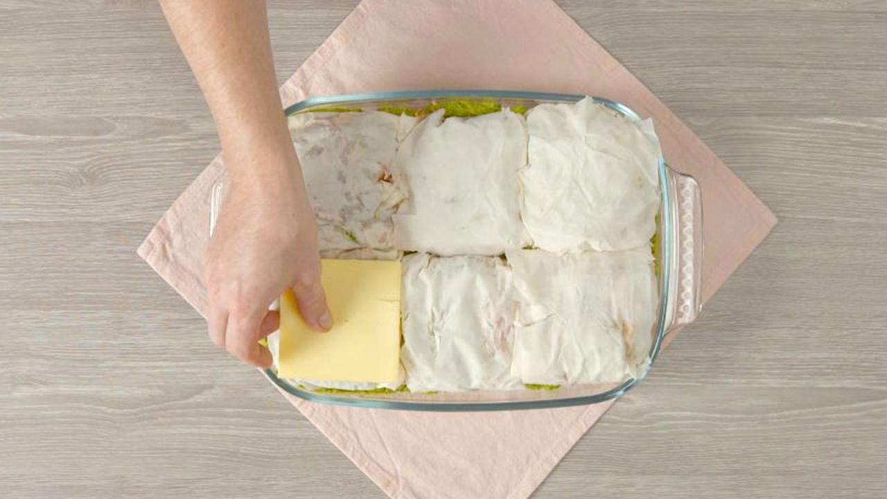 8. Nun kommen die restlichen 6 Päckchen als zweite Lage nebeneinander in die Auflaufform. Auch sie werden mit Butter bestrichen und es wird eine weitere Scheibe Käse auf jedes Päckchen gelegt.