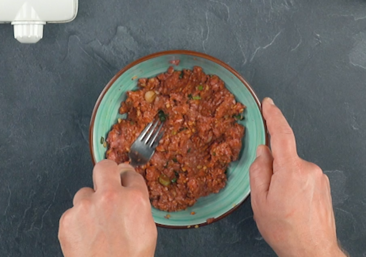 3. Gib Hackfleisch, Tomatenmark, klein geschnittenen Ingwer, Salz, Pfeffer, Fünf-Gewürze-Pulver, Sojasoße, Austernsoße, Sesamöl und klein geschnittenen Frühlingslauch in eine Schüssel und vermenge alles miteinander. Stelle die Mischung am besten 1 Stunde kalt.