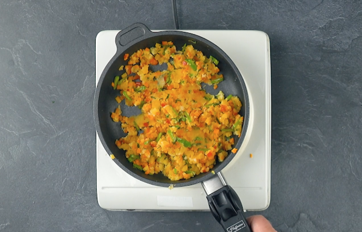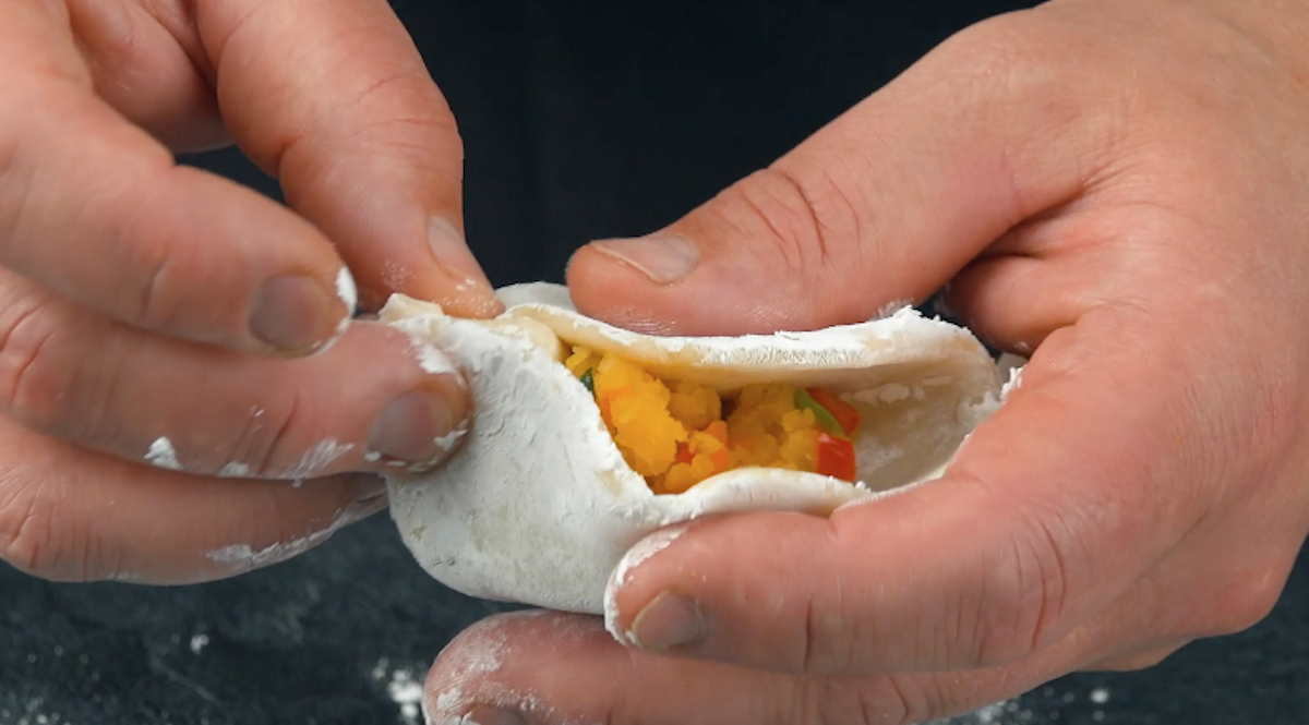 2. Nun wird die erste Füllung zubereitet. Gib Sesamöl in eine Pfanne und füge klein geschnittene Karotte, Paprika, Zuckererbsen und Chinakohl hinzu. Würze alles mit Salz, Pfeffer und Koriander. Brate alles an und hebe dann den Kartoffelbrei unter. Lasse alles etwas abkühlen.