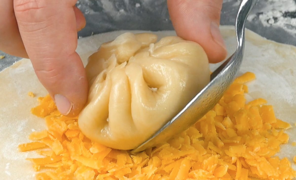 5. Schneide wieder ein Stück vom Teig ab und rolle es rund aus. Verteile nun geriebenen Cheddar auf dem Teig. Setze den bereits gegarten Dumpling auf den Käse und verschließe den Teig wieder. Gare diesen Doppel-Dumpling wieder ca. 10 bis 12 Minuten im Wasserdampf.