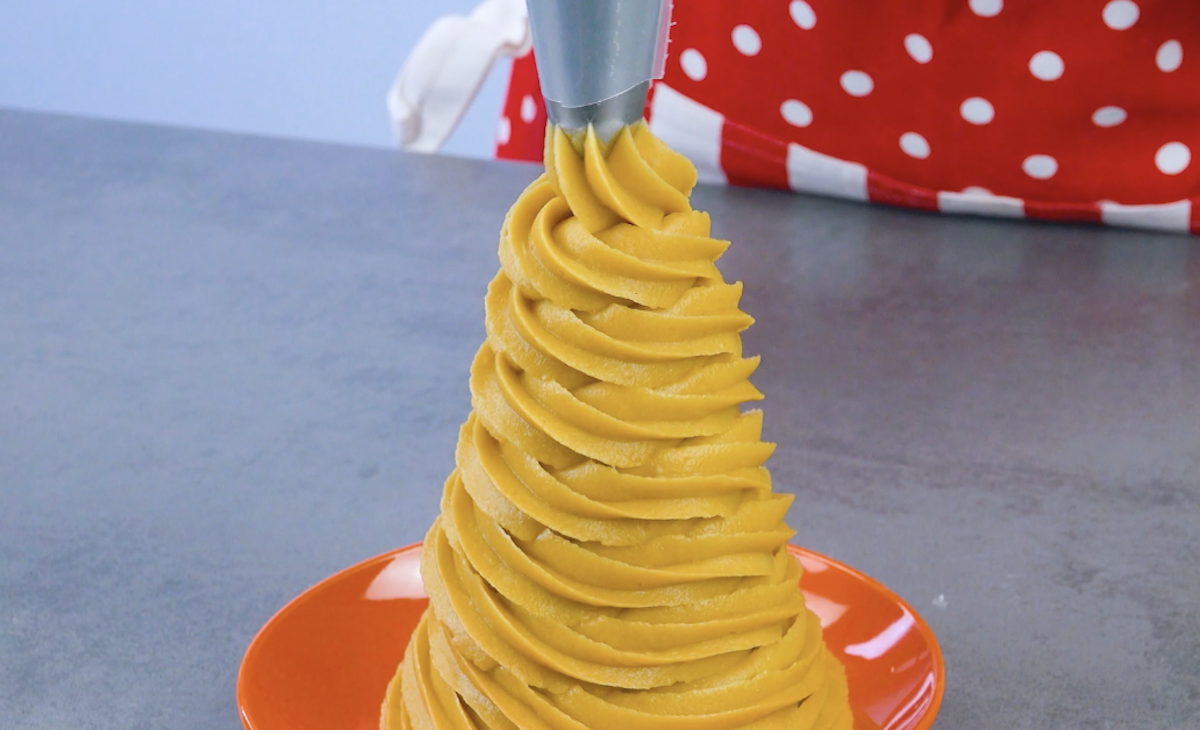2. Fülle den Brandteig in einen Spritzbeutel mit großer Sterntülle. Dressiere den Teig um einen Partyhütchen herum und friere ihn ein.