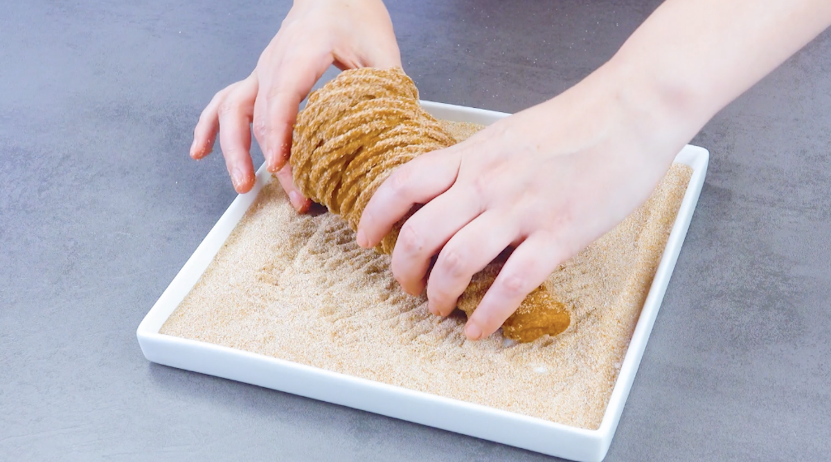 3. Wenn die Churro-Tüte gefroren ist, entferne das Partyhütchen und frittiere das Gebäck in heißem Fett, bis es goldbraun ist. Lasse die Churro-Tüte auf etwas Küchenpapier abtropfen und wälze sie dann in Zimt und Zucker.