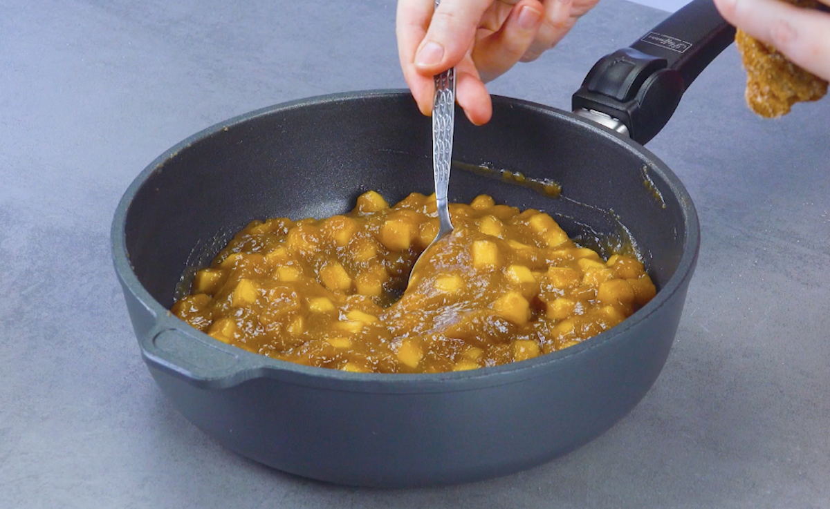 4. Schneide die Äpfel klein und verrühre sie mit Zitronensaft und Zitronenzeste. Koche dann in einem Topf Wasser mit weißem und braunem Zucker, Gewürzmischung, Stärke und Salz auf und gib nach 3 Minuten Köcheln die Apfelstückchen hinzu. Lasse alles weitere 8 Minuten köcheln und dann abgedeckt abkühlen.