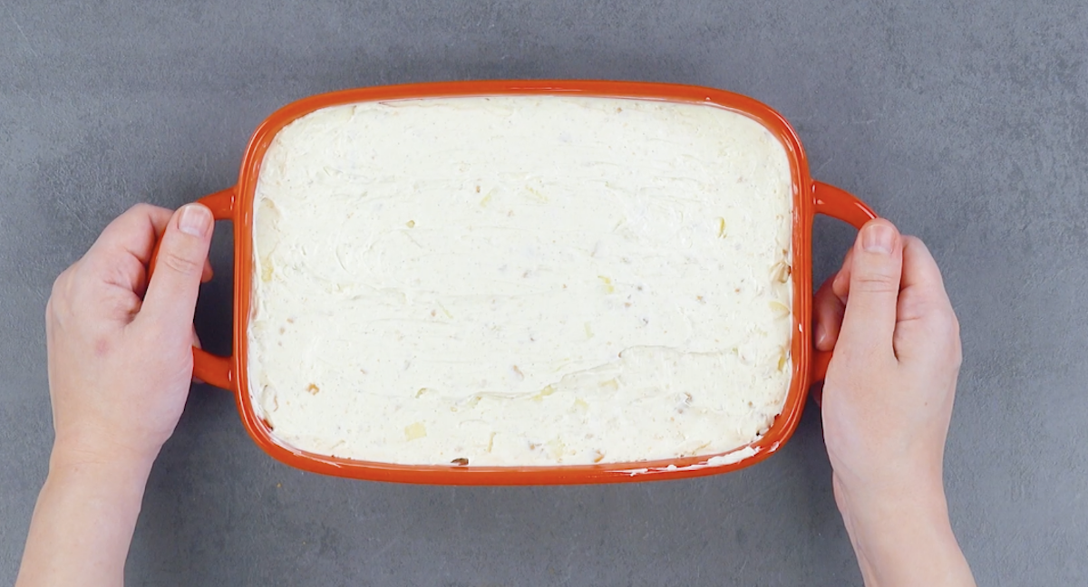 5. Erwärme Sahne und gieße sie über die kleingehackte weiße Kuvertüre. Verrühre alles, bis sich die Schokolade komplett aufgelöst hat. Lasse die Schokolade auf Zimmertemperatur abkühlen. Schlage dann Butter auf, bis sie weiß ist. Gib die abgekühlte Schokolade nach und nach zur aufgeschlagenen Butter und verrühre alles so lange, bis es sich gut miteinander vermengt hat. Gib noch zerbröselte Butterkekse, Apfelstückchen und Zimt hinzu, vermische alles und fülle es in eine Schüssel oder in eine Auflaufform. Streiche alles schön glatt und friere die Creme ein.