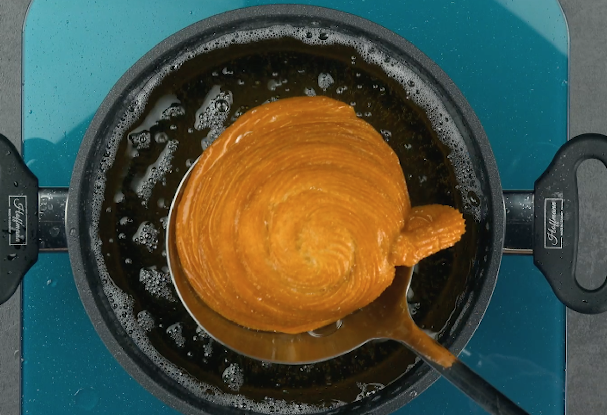 5. Erhitze Pflanzenfett in einem Topf auf etwa 160 °C und frittiere die gefrorenen Tassen. Wichtig ist, dass die gesamte Tasse im Fett ist. Hilf mit einem Schaumlöffel vorsichtig nach. Wenn die Tasse goldbraun und knusprig ist, hole sie vorsichtig aus dem heißen Fett heraus. Bestreue sie mit Zimt und Zucker.