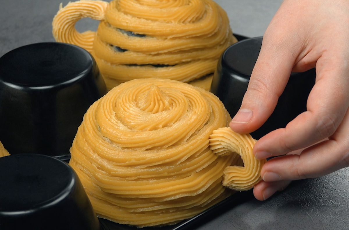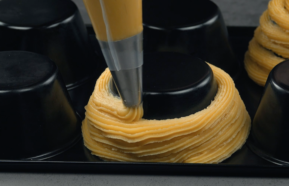 3. Fette die Unterseite einer Muffinform mit reichlich Pflanzenöl ein. Spritze dann den Brandteig um die einzelnen Ausstülpungen herum. Achte darauf, dass keine Lücken entstehen. Das Ende muss etwas angedrückt werden, damit ein richtiger Tassenboden entsteht.
