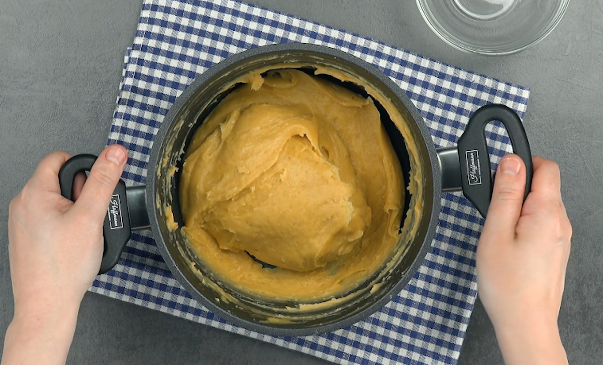 1. Gib Butter, Zucker und Wasser in einen Topf und koche alles auf. Füge Mehl hinzu und verrühre alles mit einem Holzlöffel, bis der Teig glatt ist und sich von der Topfwand löst. Wenn der Teig leicht abgekühlt ist, gib Vanillearoma und ein Ei nach dem anderen hinzu. Verrühre alles noch einmal mit dem Löffel. Fülle den Brandteig in einen Spritzbeutel mit Sterntülle.