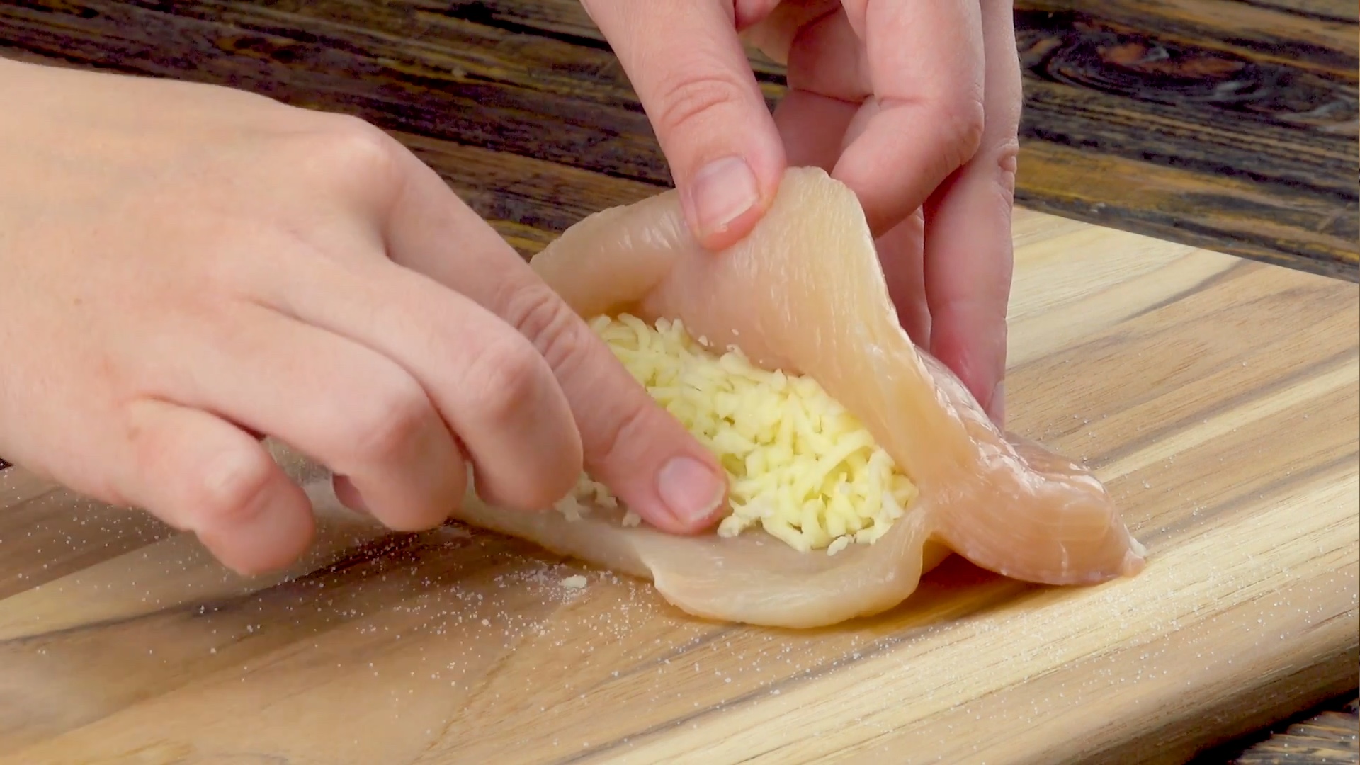 1.) Streue deinen Arbeitsbereich mit Salz aus. Platziere eine Hühnerbrust darauf, streue auch auf deren Oberseite etwas Salz und schneide eine Tasche ins Fleisch. Fülle diese Tasche mit Mozzarella aus und drücke das Fleisch anschließend fest zusammen. Befülle so auch die übrigen Hühnerbrüste.