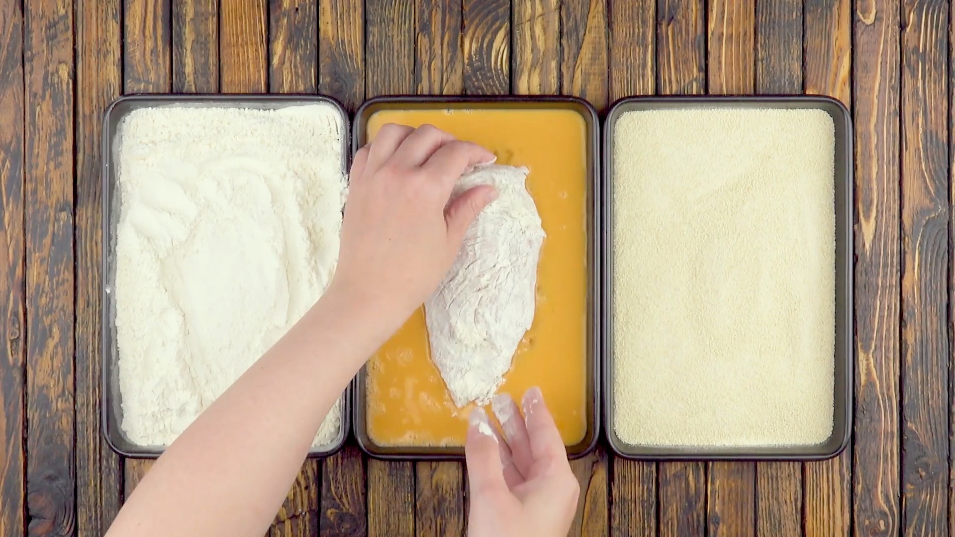 2.) Wälze die gefüllten Hühnerbrüste in reichlich Mehl, Ei und zum Schluss in Semmelbröseln. Achte darauf, eine geschlossene Schicht Panade zu erzeugen. Bei Bedarf wiederhole die Arbeitsschritte einfach.
