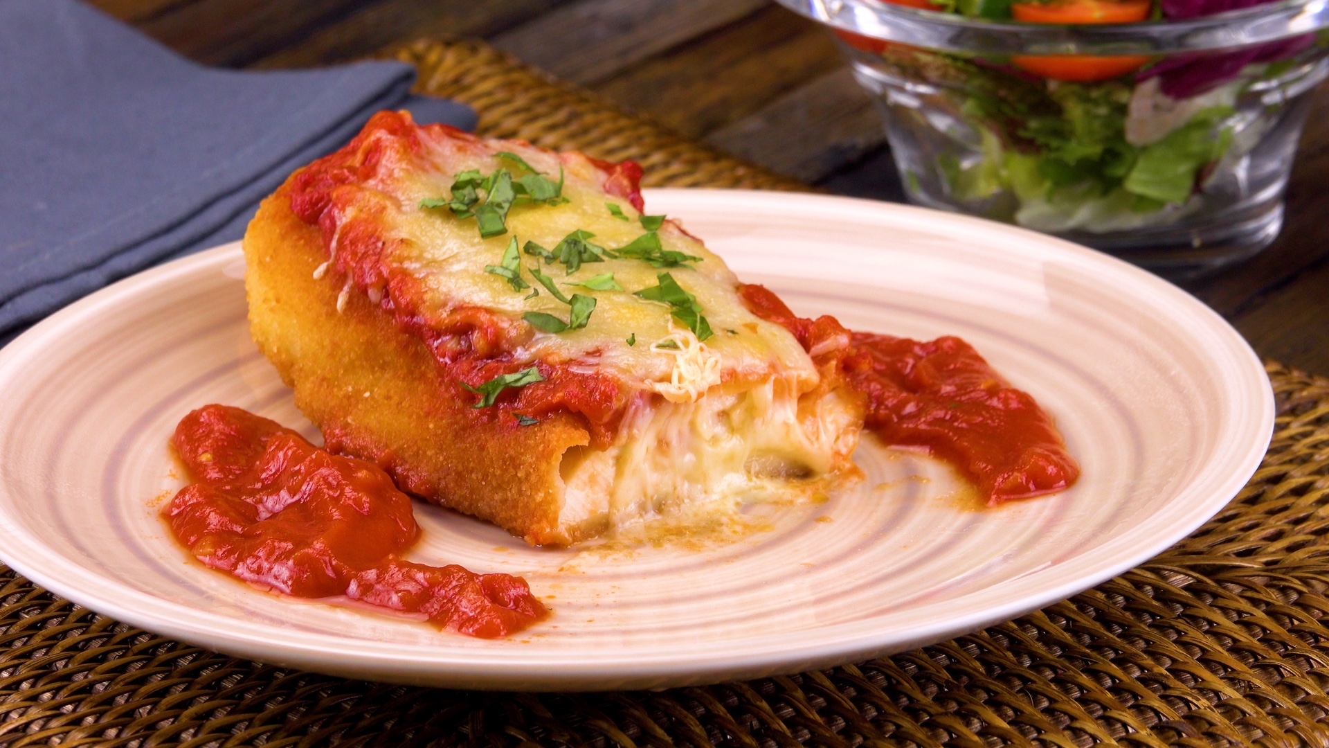 Ganz leicht: Hühnerbrust-Cordon-bleu wird mit Käse überbacken und mit Tomatensoße serviert.