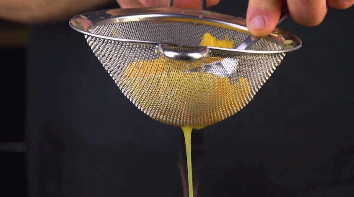 3.) Halbiere eine Orange, löse das Fruchtfleisch mit einem Löffel heraus und presse über einem Sieb den Saft in einen Topf. Gib in den Topf noch Honig, Salz, Pfeffer und Paprikapulver hinzu. Lasse die Marinade dann kurz aufkochen.