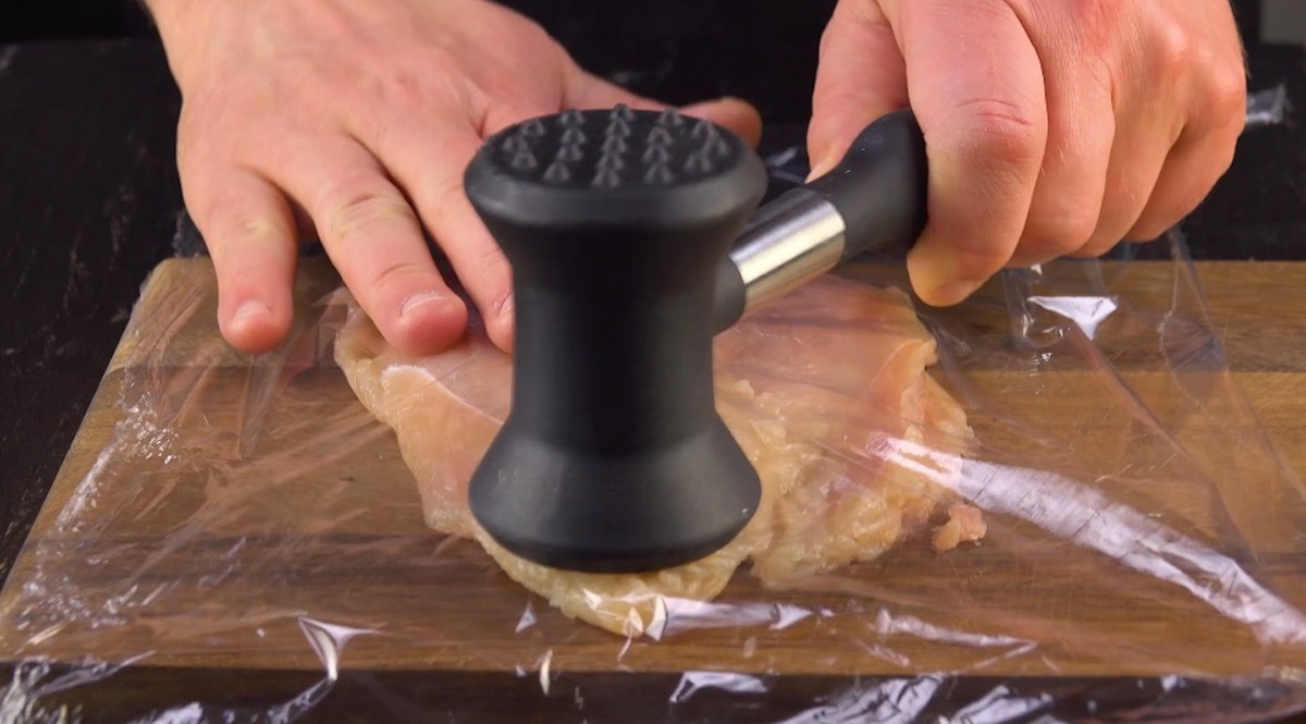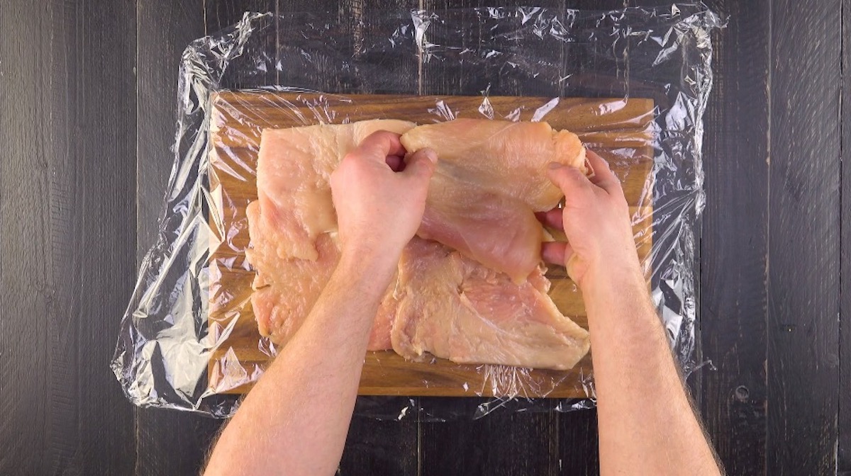 1.) Schneide die Hähnchenbrüste in der Mitte längs auf und klappe sie auseinander. Lege Frischhaltefolie auf sie und plätte das Fleisch mit einem Fleischklopfer.