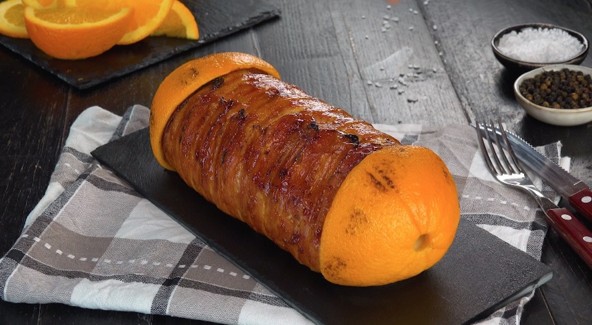6.) Wickle 16 Scheiben Frühstücksbacon um die Fleischrolle herum und stecke die beiden Orangenschalen, die aus Schritt 3 übrig geblieben sind, links und rechts auf den Kochlöffel, der aus der Fleischrolle herausragt.