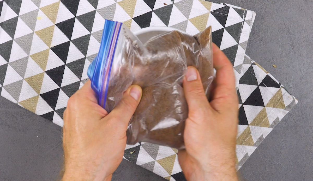So geht es: 1.) Gib die Haselnüsse in einen Mörser und zerkleinere sie. Fülle die zerstoßenen Nüsse in eine Schüssel um und füge zerbröselte Schokokekse hinzu. Diese bekommst du durch einen ganz simplen Trick klein: Stecke sie in einen Plastikbeutel und zerdrücke sie mit deinen Händen.