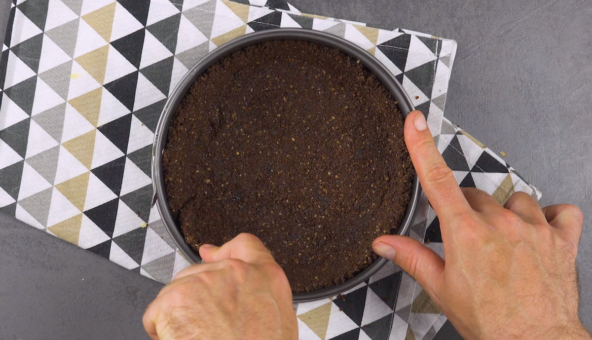 3.) Lege den Boden einer Springform mit Backpapier aus und gib den Keksboden darauf. Drücke den Boden (auch an den Seiten) mit einem Löffel fest. Stelle die Form für ca. 10 bis 15 Minuten in den Kühlschrank.