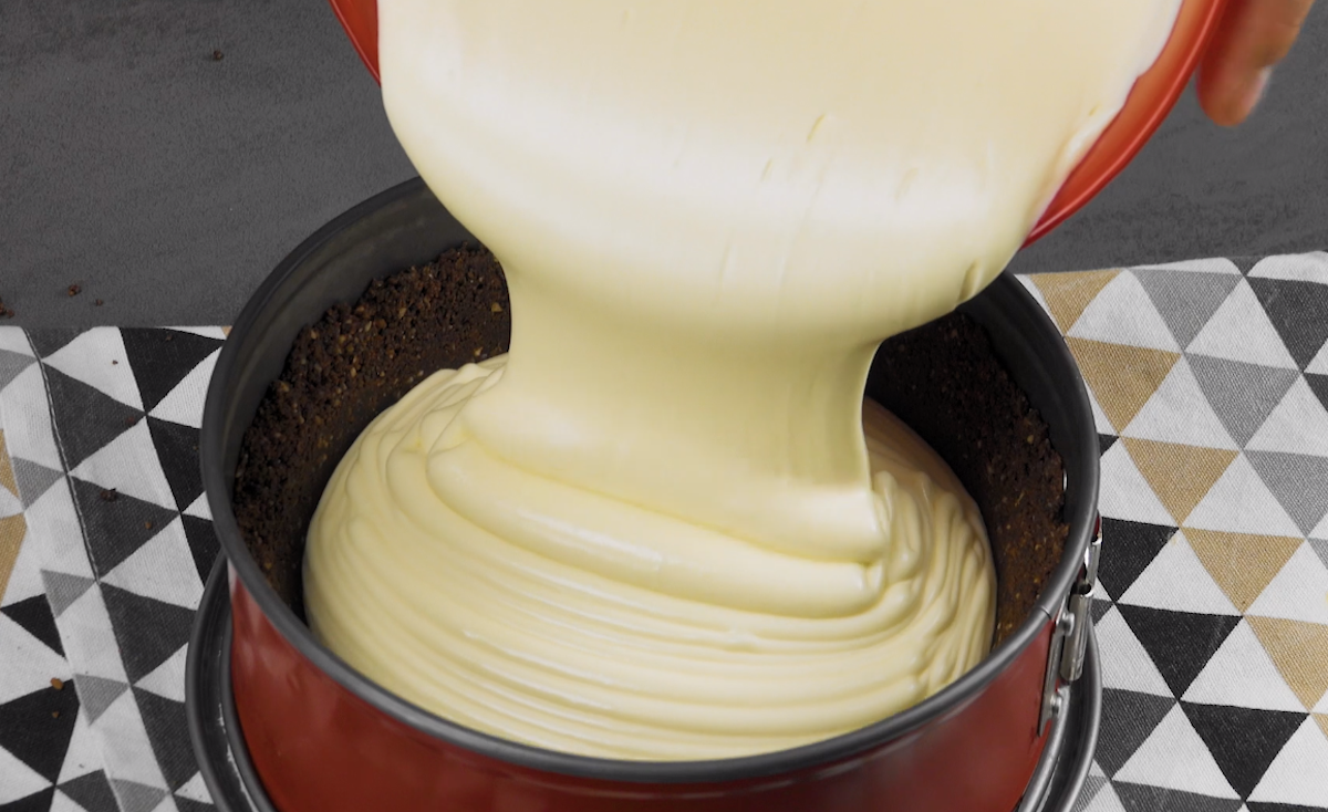 5.) Zerkleinere mit einem Messer die weiße Schokolade und gieße erhitzte Sahne darüber, sodass sie schmilzt. Verrühre die Schoko-Creme und lasse sie kurz abkühlen. Bevor du die Schoko-Masse zu der Frischkäse-Masse gibst, achte darauf, dass sie beide in etwa die gleiche Temperatur haben. Mixe alles miteinander auf höchster Stufe und gieße die fertige Creme in die Kuchenform mit dem Keksboden.