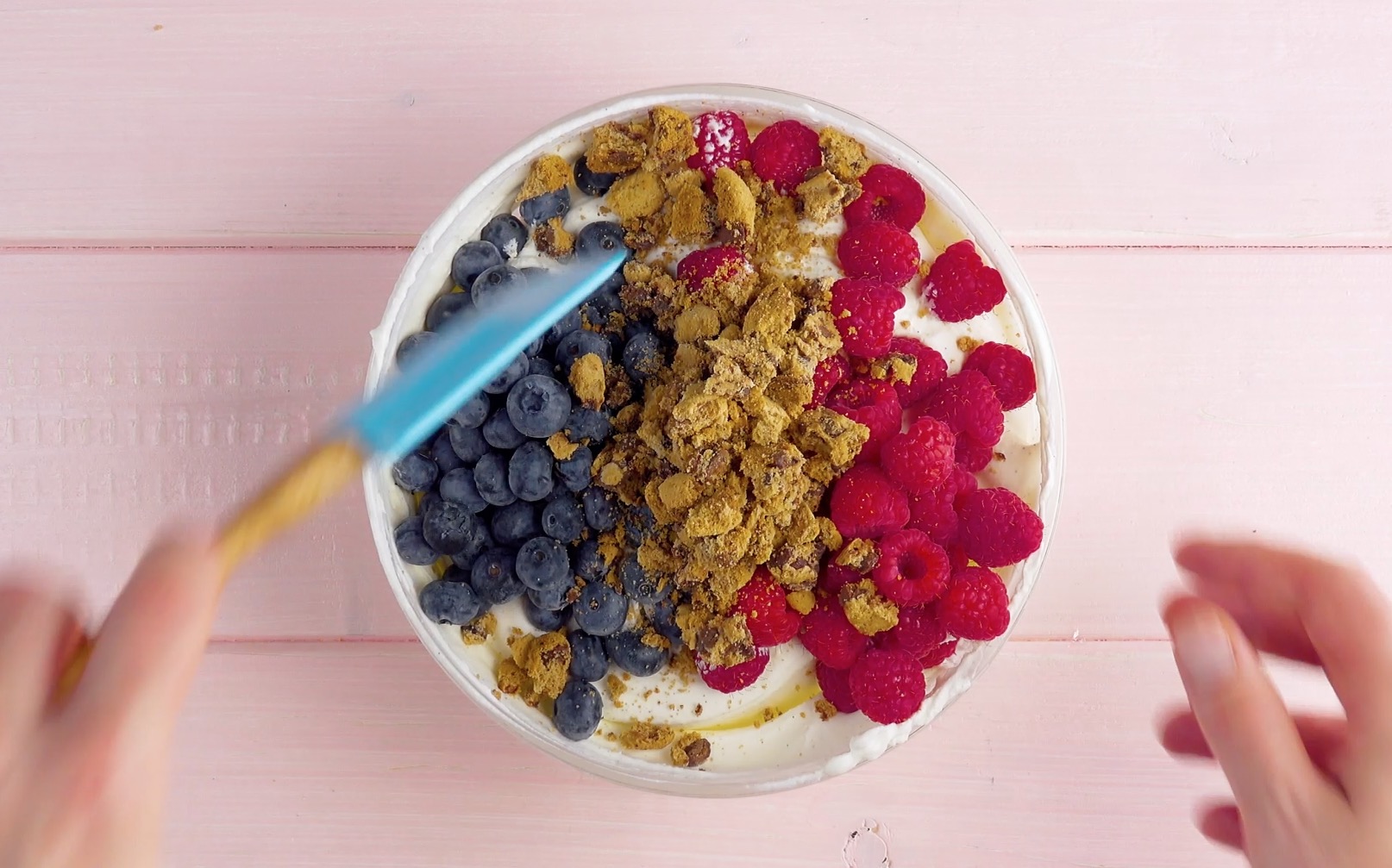 Hebe dann vorsichtig die Schlagsahne unter und gib die Beeren auf die Creme. Anschließend bröselst du die zweite Portion Cookies darauf. Vermische dann alles noch einmal gründlich.