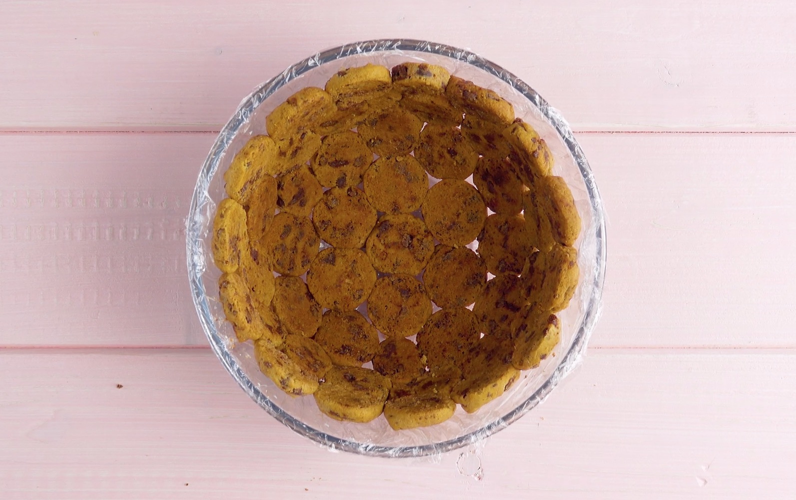1.) Kümmere dich zuerst um die leckere Knusperhülle: Dafür tauchst du ein Cookie nach dem anderen in Milch und legst mit ihnen dann eine mit Frischhaltefolie ausgekleidete große Schüssel aus. Fange am Boden der Schüssel an und lege die kleinen Kekse dicht aneinander bis zum oberen Rand.