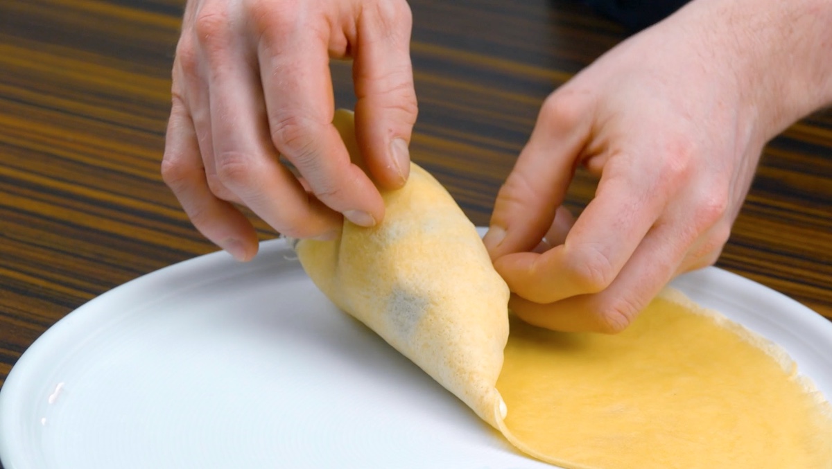 4. Halbiere dann die Crêpes und rolle sie, beginnend mit der belegten Hälfte, fest zu einem Hörnchen auf.