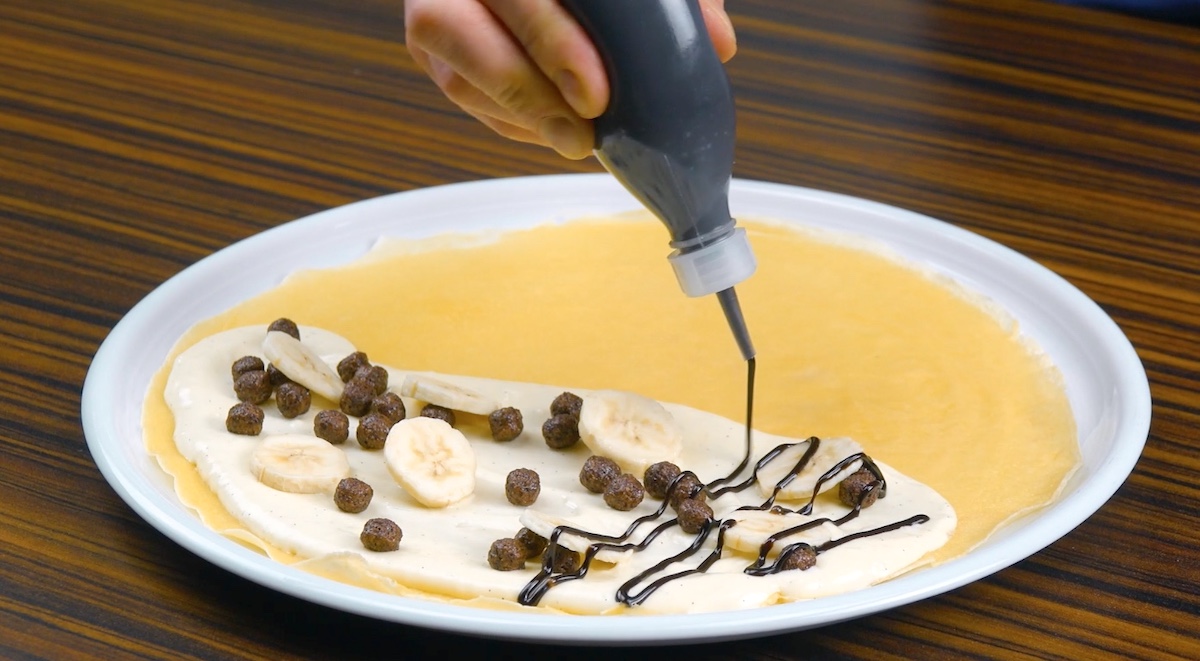 3. Bestreiche jeweils eine Hälfte der Crêpes mit Pudding, belege diesen mit Bananenscheiben sowie Schokopops und verteile etwas Schokosauce darüber.