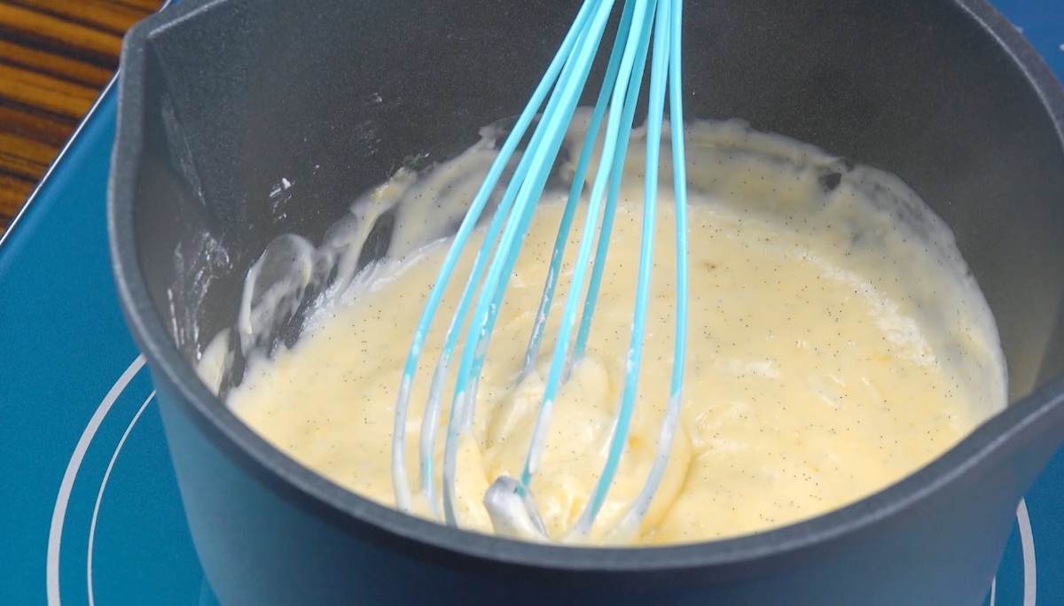 1. Koche für den Pudding zunächst Sahne, Zucker und das Mark der Vanilleschote sowie die Schote selbst in einem Topf auf. Verrühre Milch, Stärke und Salz und füge die Mischung der köchelnden Sahnemischung hinzu. Lass das Ganze für 30 Sekunden und unter ständigem Rühren kochen. Nimm dann die in Hälften geschnittene Vanilleschote aus dem Pudding und lass diesen 5 Minuten abkühlen, bevor du das Eigelb in den warmen Pudding rührst. Stelle den Pudding dann für mindestens 2 Stunden in den Kühlschrank.