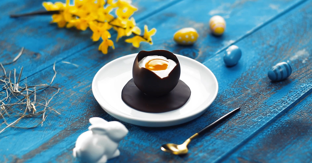 Das komplette Rezept für das Sahne-Mousse im Schoko-Ei inklusive der Anleitung für den Eierbecher aus Schokolade findest du hier.