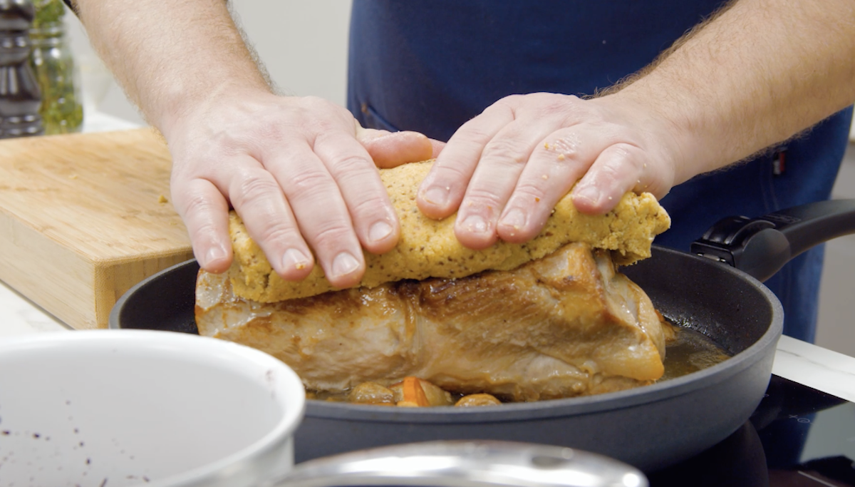5. Wenn der Braten fertig ist, hole ihn aus dem Ofen und stelle den Ofen auf Grill-Funktion. Drücke die Kruste auf den Braten und stelle ihn für ca. 4 bis 6 Minuten nochmals in den Ofen (die Kartoffeln können ruhig im Ofen bleiben).