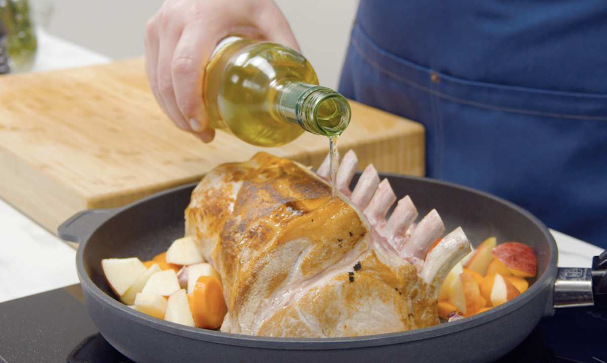 1. Salze das Fleisch und reibe es von allen Seiten mit Pflanzenöl ein. Lass die Pfanne heiß werden und brate das Carreé von allen Seiten goldbraun an. Gib Knoblauch, Karotten und Äpfel mit in die Pfanne und brate alles kurz mit an. Lösche das Ganze mit Weißwein ab und lass alles kurz aufkochen. Schiebe nun die Pfanne (ohne Griff) bei 145 °C Umluft für ca. 40 bis 55 Minuten in den Ofen (die Garzeit variiert je nach Gewicht des Fleisches).