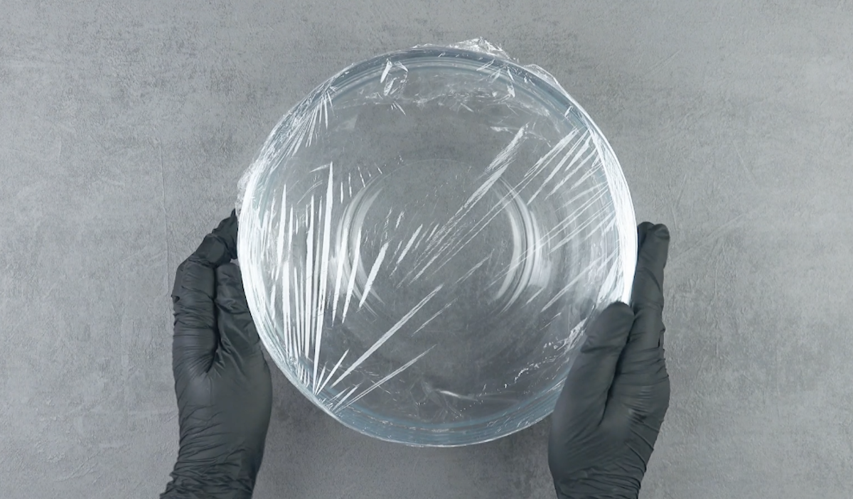 4.1 Decke eine Schüssel mit mikrowellengeeigneter Klarsichtfolie ab (wickle am besten die ganze Schüssel mit Folie ein, so hält alles besser).