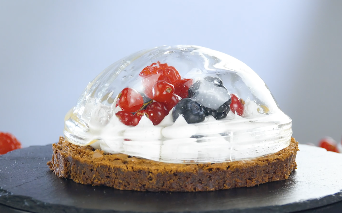 4.4 Löse die Zucker-Kuppel von der Folie und dekoriere das gewünschte Dessert damit.