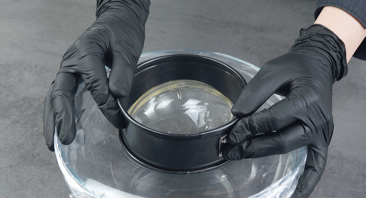 4.3 Wenn der flüssige Zucker etwa die Temperatur von 139 °C erreicht hat, gieße ihn auf die gespannte Folie. Drücke die gefrorene Springform auf die Folie und mit leichter Kraft nach unten, sodass eine Kuppel entsteht. Halte die Springform so lange auf die Folie gedrückt, bis der Zucker abgekühlt und fest geworden ist (hierbei kannst du mit der Kaltluftfunktion eines Föhns nachhelfen).