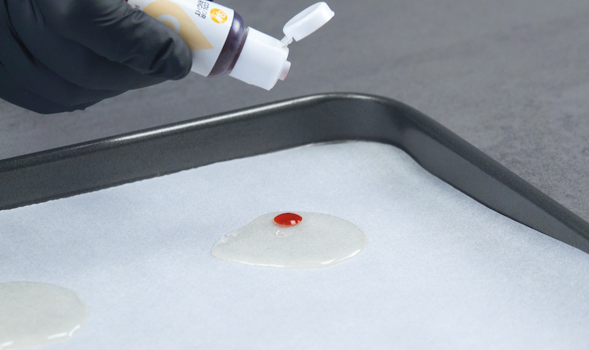2.1 Lege ein Backblech mit Backpapier aus. Gib dann ein paar Kleckse von Reissirup auf das Papier. Färbe diese mit verschiedenen Farben von Lebensmittelfarbe ein (ein paar Tropfen reichen).