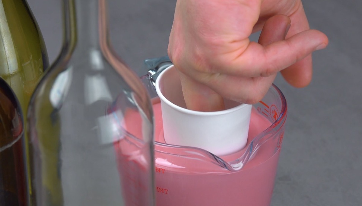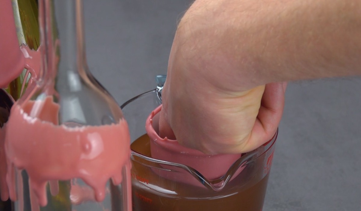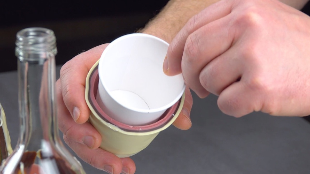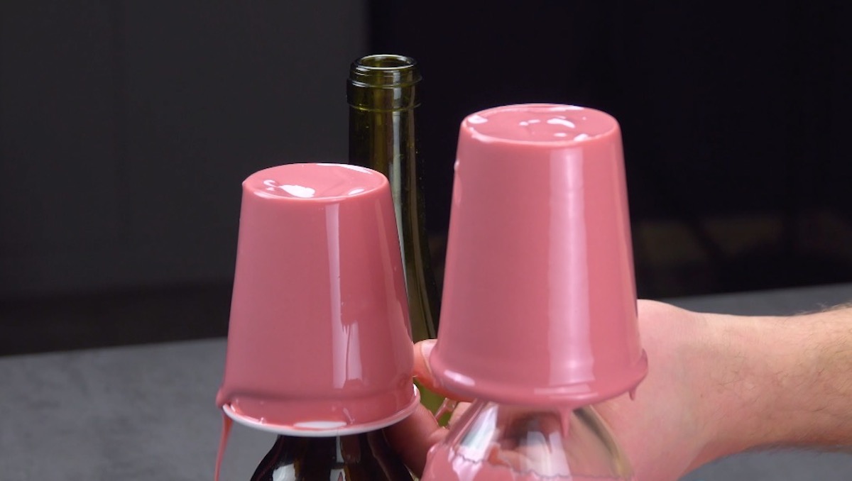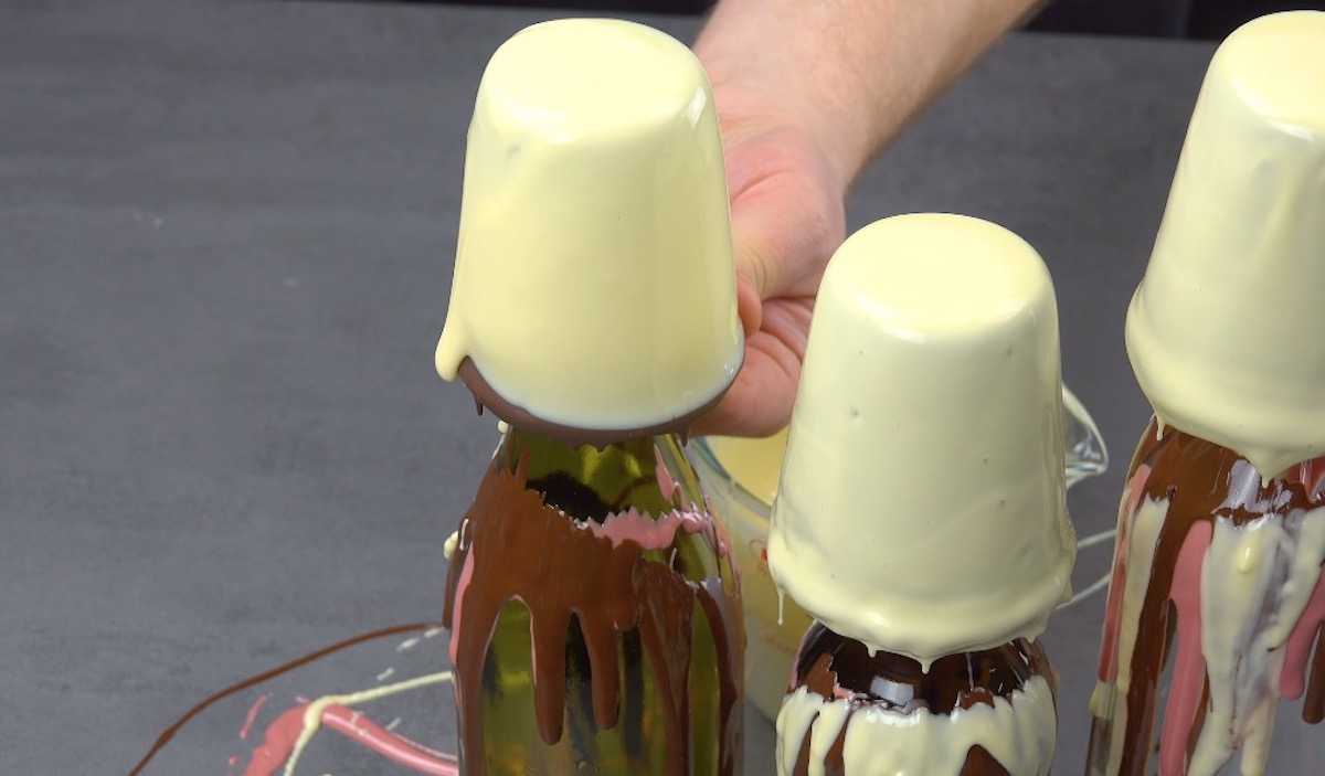 2.) Drehe den Becher rasch um und stülpe ihn über einen Flaschenhals. So kann die überschüssige Schokolade abfließen und die erste Schicht wird fest. Wiederhole dies mit den beiden anderen Bechern.