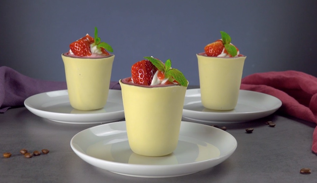 Habt ihr schon einmal Ruby-Schokolade probiert? Schokolade aus der Ruby-Kakaobohne ist rosa und hat einen ganz besonderen Geschmack. Perfekt also für unser farbenprächtiges Dessert! Die leckeren Becher aus drei Schichten Schokolade sind nicht nur ein richtiger Hingucker, sie sind in der Kombination mit Erdbeeren und Sahne auch ausgesprochen köstlich.