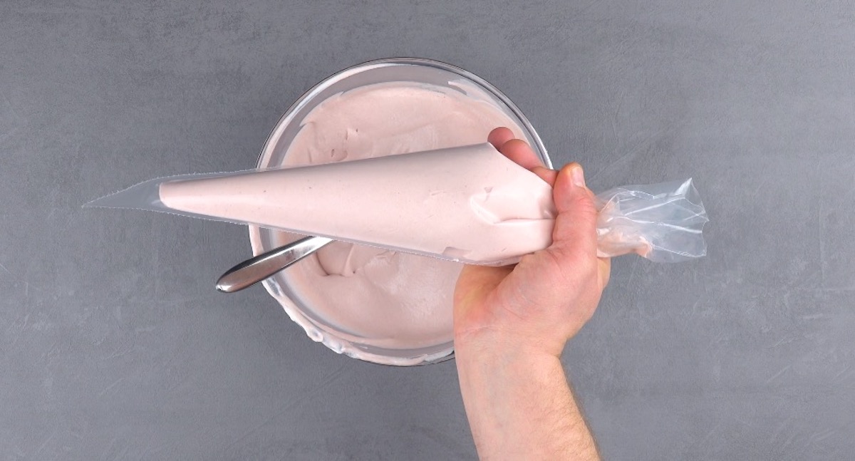 6.) Erwärme nun fertige Erdbeersauce und lasse die weiße Schokolade darin schmelzen. Diese muss kurz abkühlen. Hebe geschlagene Sahne unter und fülle die Mousse in einen Spritzbeutel.