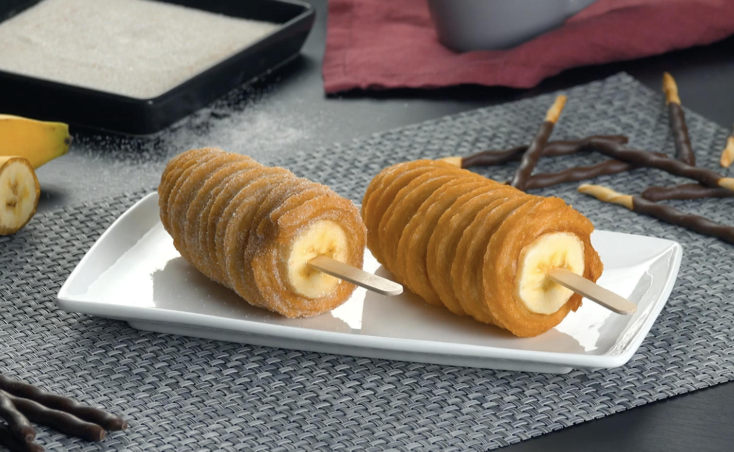 Wer schon einmal in Spanien war, weiß, wie beliebt Churros dort sind. Dieser köstliche, süße Snack ist ein Fettgebäck, welches in Zimt und Zucker gewendet wird und dir alle Sinne raubt. Am besten verzehrst du sie mit Schokoladensoße. Eine noch bessere Variante findest du bei uns: Hier trifft Banane auf Churros. Wir spießen das beliebteste Obst der Deutschen auf einen Eisstiel und kleiden es in Brandteig. Dann frittieren wir den Bananen-Churro und verfeinern ihn mit Zimt und Zucker. Zu guter Letzt tunken wir das gute Stück noch in Schokoladensoße. Na, bekommst du schon Schnappatmung? Hier findest du das Rezept für die Bananen-Churros.