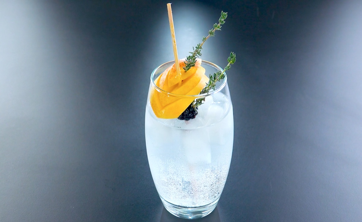 Schneide die Nektarine in Viertel und schneide eines davon mehrmals schräg ein, sodass sich die Schnitte mittig treffen. Fächere dieses Nektarinenviertel dann etwas auf und schiebe es zusammen mit einer Brombeere sowie mit Thymianzweigen auf einen Holzspieß.
