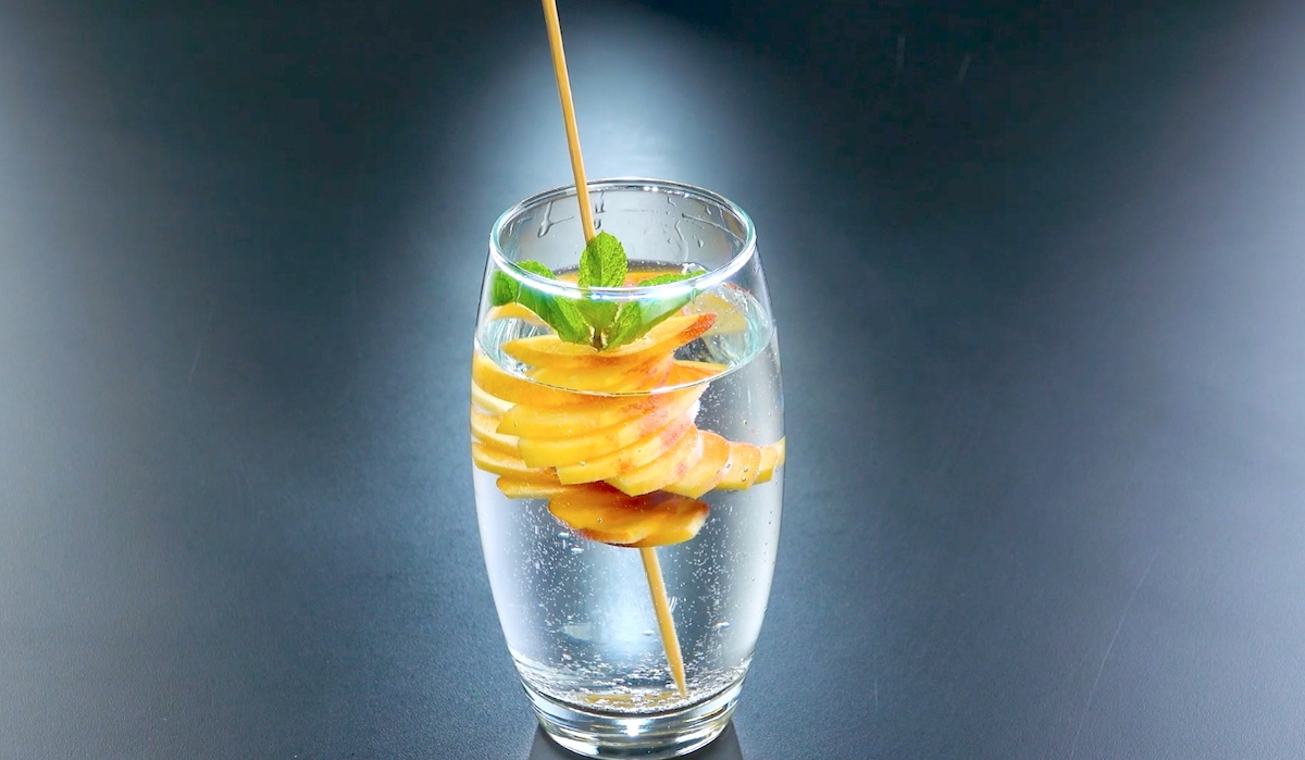 Halbiere die Nektarine und schneide eine Hälfte in dünne Scheiben. Schiebe die Scheiben mittig auf einen Holzspieß und fächere sie auf. Schiebe zum Abschluss noch etwas Minze auf den Spieß.