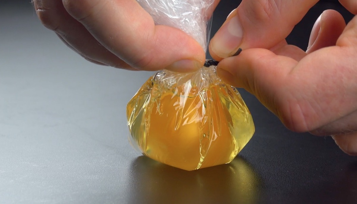 1.1) Lege die Frischhaltefolie in eine kleine Schale und gib ein paar Tropfen Öl darauf. Schlage dann ein Ei hinein und knote die Folie mit einer Schnur oder einem Draht zusammen.