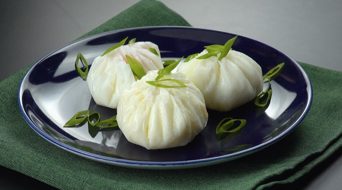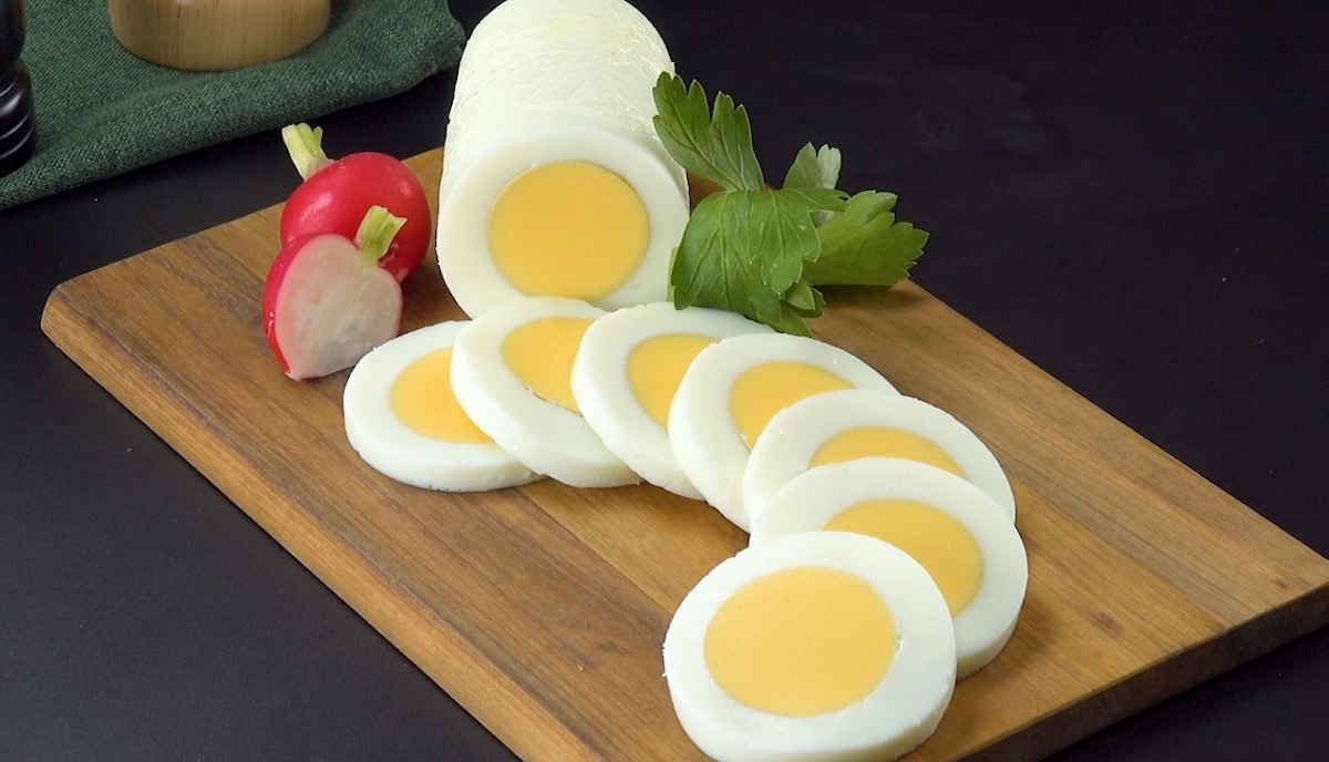 1.2) Gib die kleinen Ei-Säckchen für ca. 12-15 Minuten in heißes Wasser und schrecke sie danach unter kaltem Wasser ab. Entferne die Folie und serviere die Eier mit klein geschnittenen Frühlingszwiebeln.