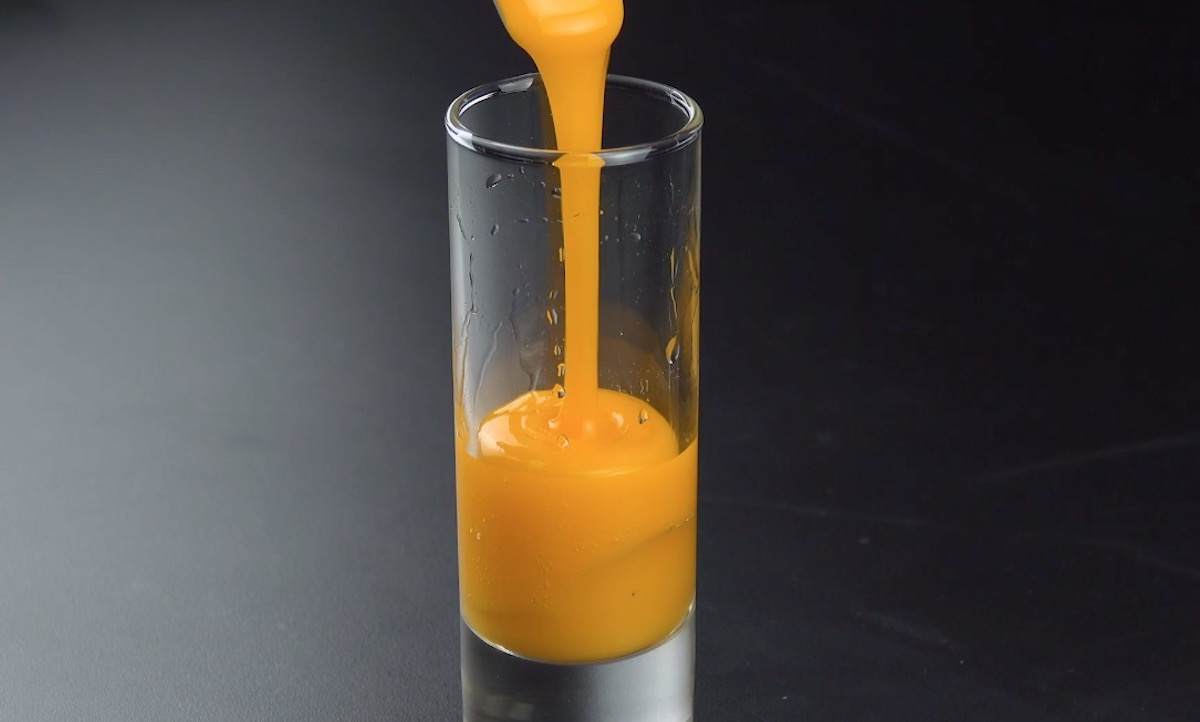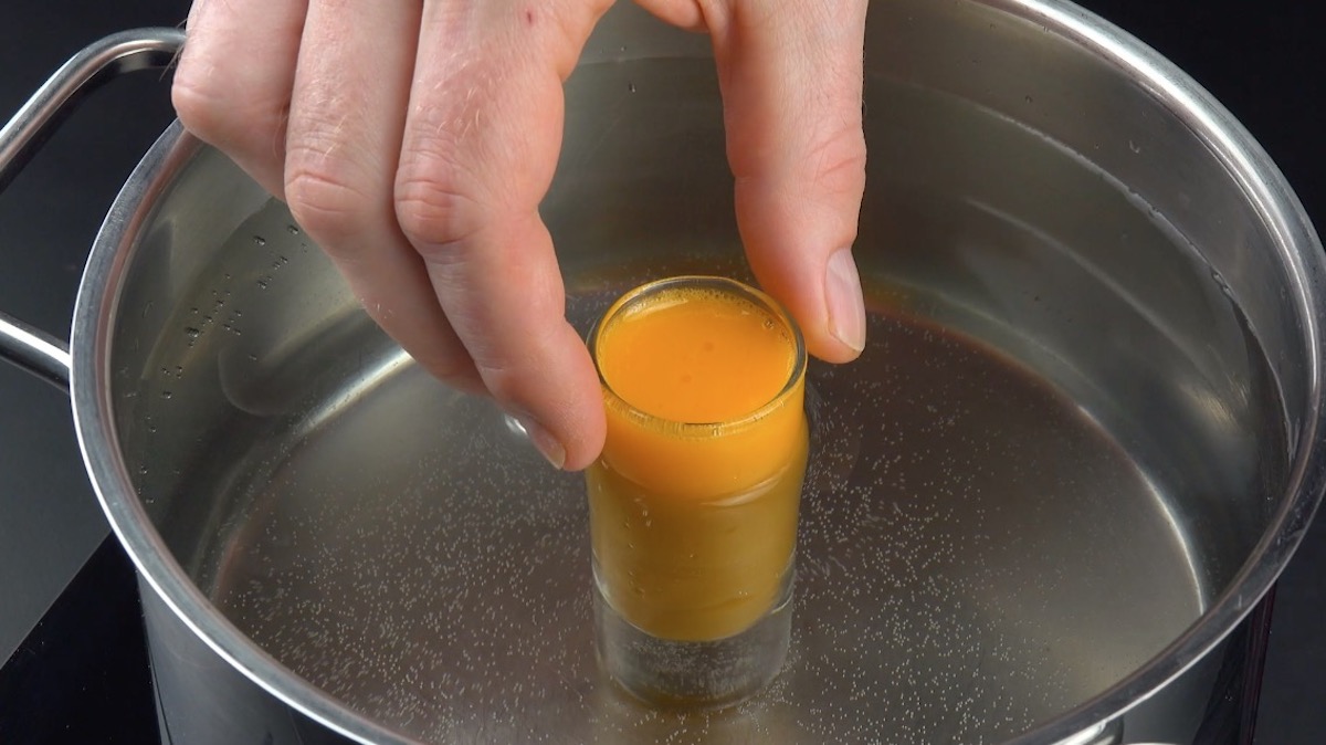4.2) Stelle das Shotglas mit dem Eigelb in einen mit Wasser gefüllten Topf und lasse das Eigelb bei ca. 90 °C fest werden.