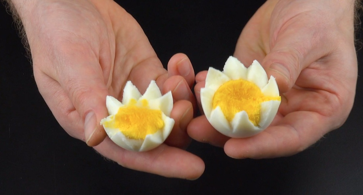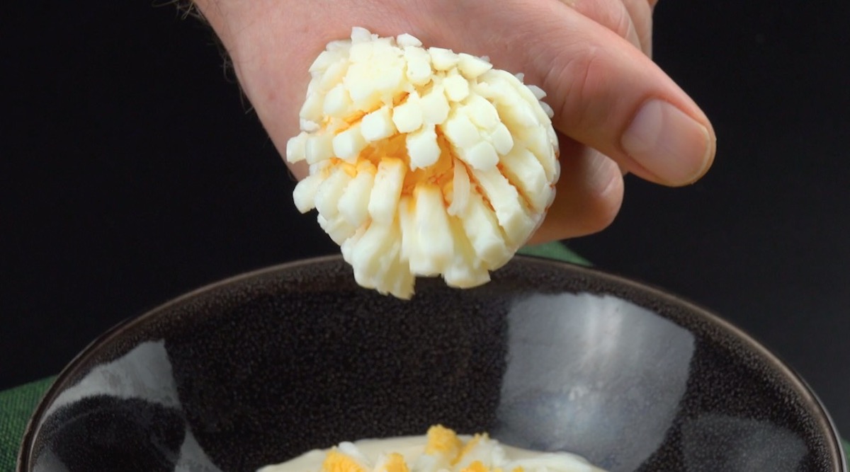 2.2) Drücke den Zahnstocher nun mittig in ein hart gekochtes Ei. Schneide dann mit der Zahnseide ein Zickzack-Muster rundherum ins Ei. Klappe das Ei auf und platziere es als richtigen Hingucker auf einem Salat.