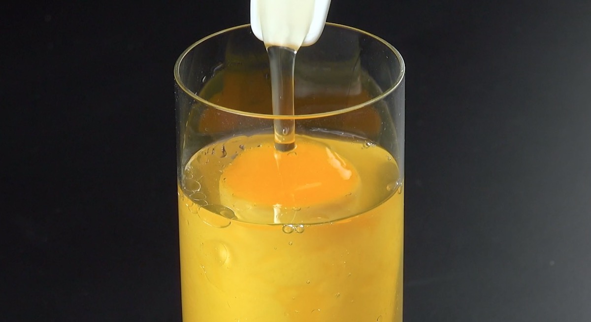 4.1) Trenne als Erstes das Eiweiß vom Eigelb. Fette dann ein Shotglas mit Öl ein und gib das verquirlte Eigelb hinein.