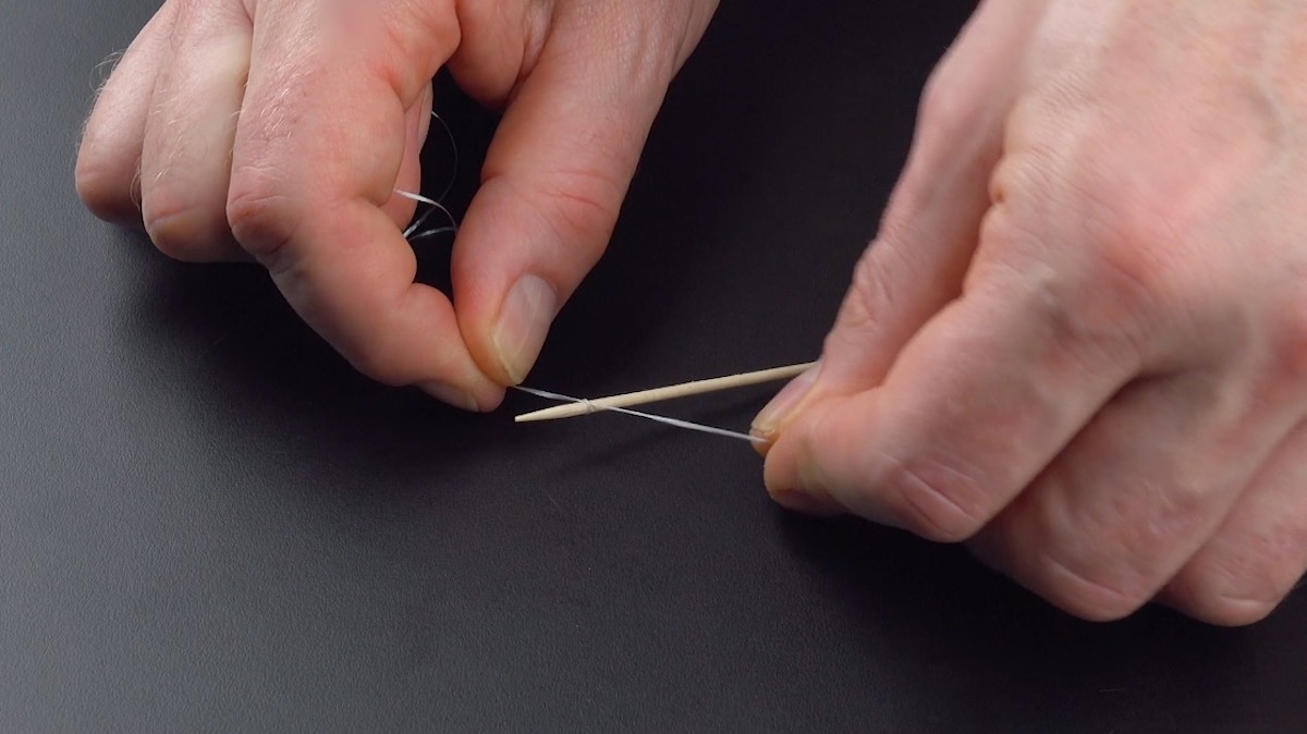 2.1) Mache in ein Stück Zahnseide einen Knoten, ziehe ihn aber noch nicht ganz zu. Stecke einen Zahnstocher in die Schlaufe und ziehe den Knoten dann zu.