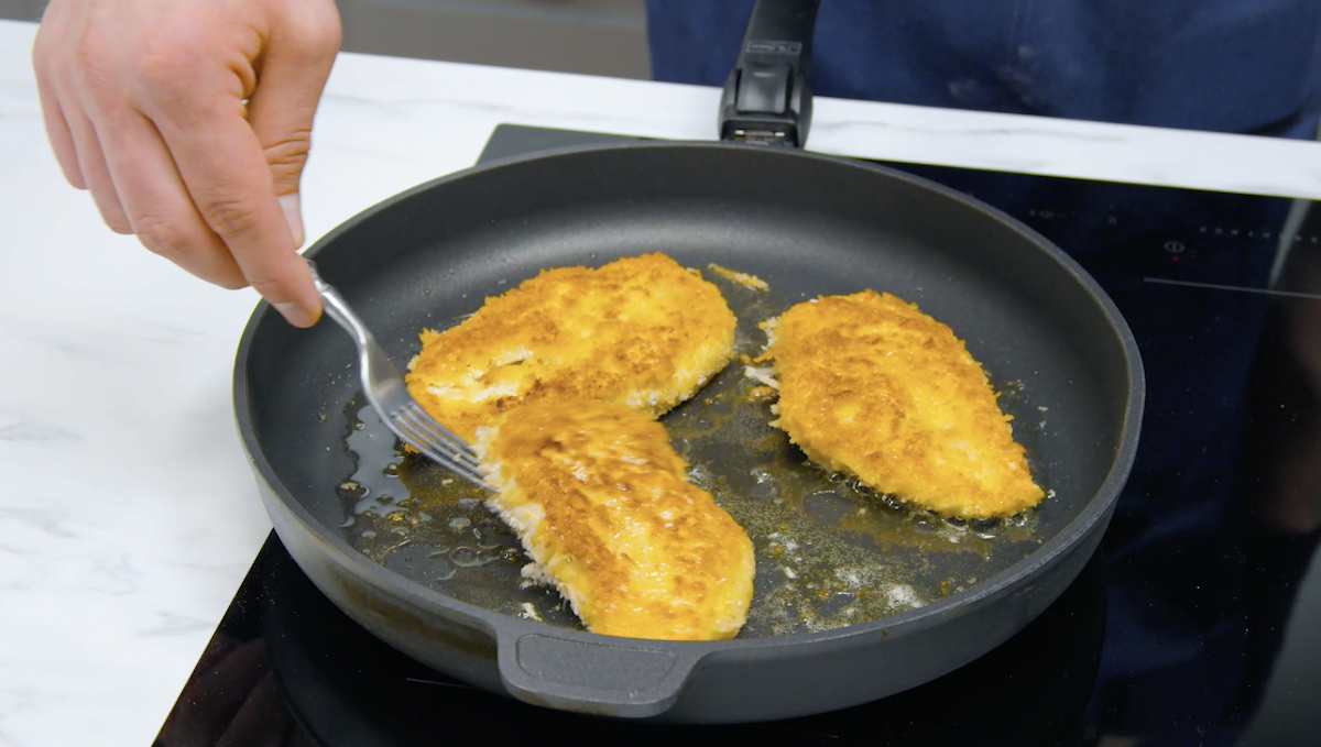 2. Plätte die Hähnchenbrüste zwischen Folienstreifen und bereite eine Panierstraße vor. In die erste Schale kommt gefrorenes, geraspeltes Toastbrot, in die zweite Schale gibst du die Eier und in die dritte Schale kommt Mehl, verfeinert mit Paprikapulver, Knoblauchpulver, Oregano, Salz und Pfeffer. Ziehe die Hähnchenbrüste zuerst durch das Mehl, dann durch das Ei und zum Schluss durch die Toastraspel. Brate das Fleisch in Öl von beiden Seiten ca. 2 Minuten an, bis es goldbraun ist. Nimm es anschließend aus der Pfanne und stelle es warm.