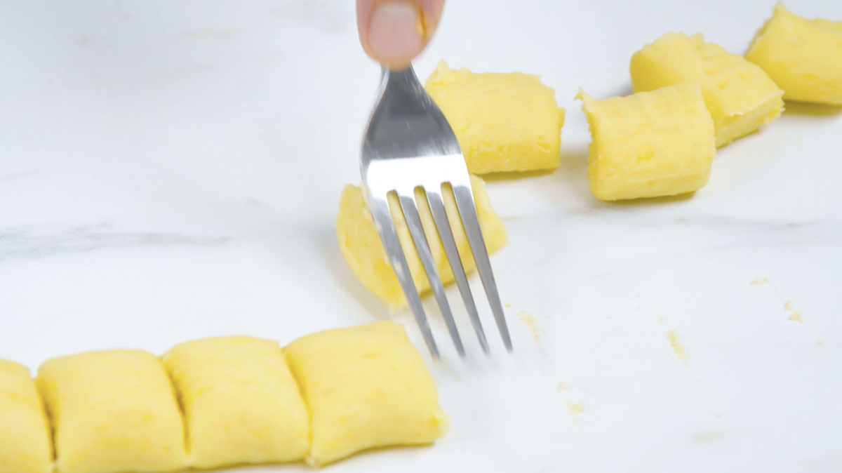 1. Gare die Kartoffeln mit Schale für 45 Minuten im Ofen. Lasse sie danach auskühlen und presse sie samt Schale durch die Kartoffelpresse (die Schale bleibt in der Presse zurück). Gib Mehl, Ei und Salz hinzu und verknete alles zu einem Teig. Forme aus dem Teig lange Stränge und teile diese dann mit einer Gabel in ca. 2 cm breite Stücke. Bringe die Stücke mit der Gabel und deren Zinken in die typische Gnocchi-Form. Koche die Gnocchi in gesalzenem Wasser, bis sie an der Oberfläche schwimmen.